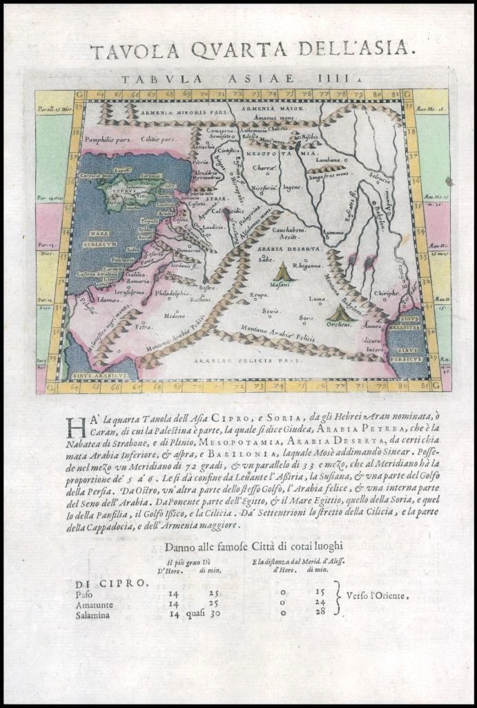 A very fine and early map of the regions of Holyland, Cyprus, Syria etc which appeared in Ptolmey's 'GEOGRAFIA CIOE DESCRITTIONE UNIVERSALE DELLA TERRA' and this being from the 1st Edition in Italian.