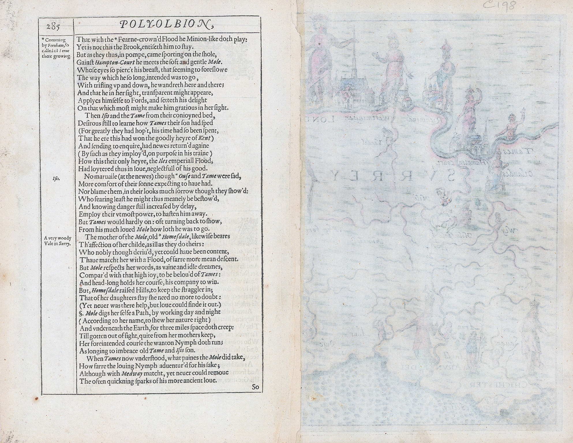 His maps are decorated with allegorical images of Goddesses, water nymphs and hunters. This example shows the cities of London, Arundel, Chichester and Hastings as well as the royal palaces of Hampton Court, Westminster and Richmond.