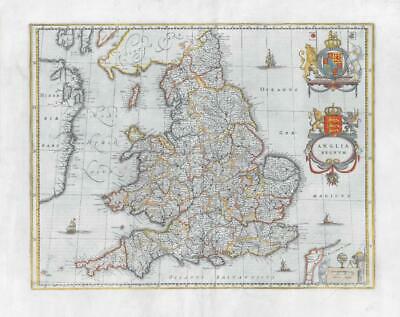 A highly decorative and sought after engraved 17th Century Map of England & Wales with the two Royal Coats of Arms. The reverse of the map is a complete set of text in Spanish describing the history and topography of the county.