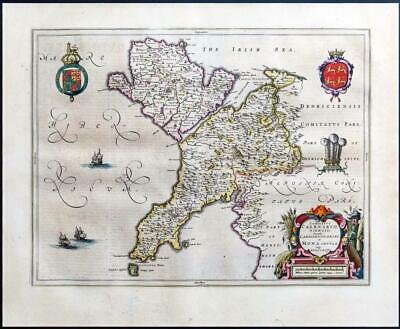 A highly decorative and finely engraved 17th Century Map of Caernarfonshire & Anglesey - Beautiful county map elaborately embellished with several coats of arms and figurative cartouches. The reverse of the map is a complete set of text in Spanish describing the history and topography of the county. Measures 450 x 570 mm with original hand colouring.