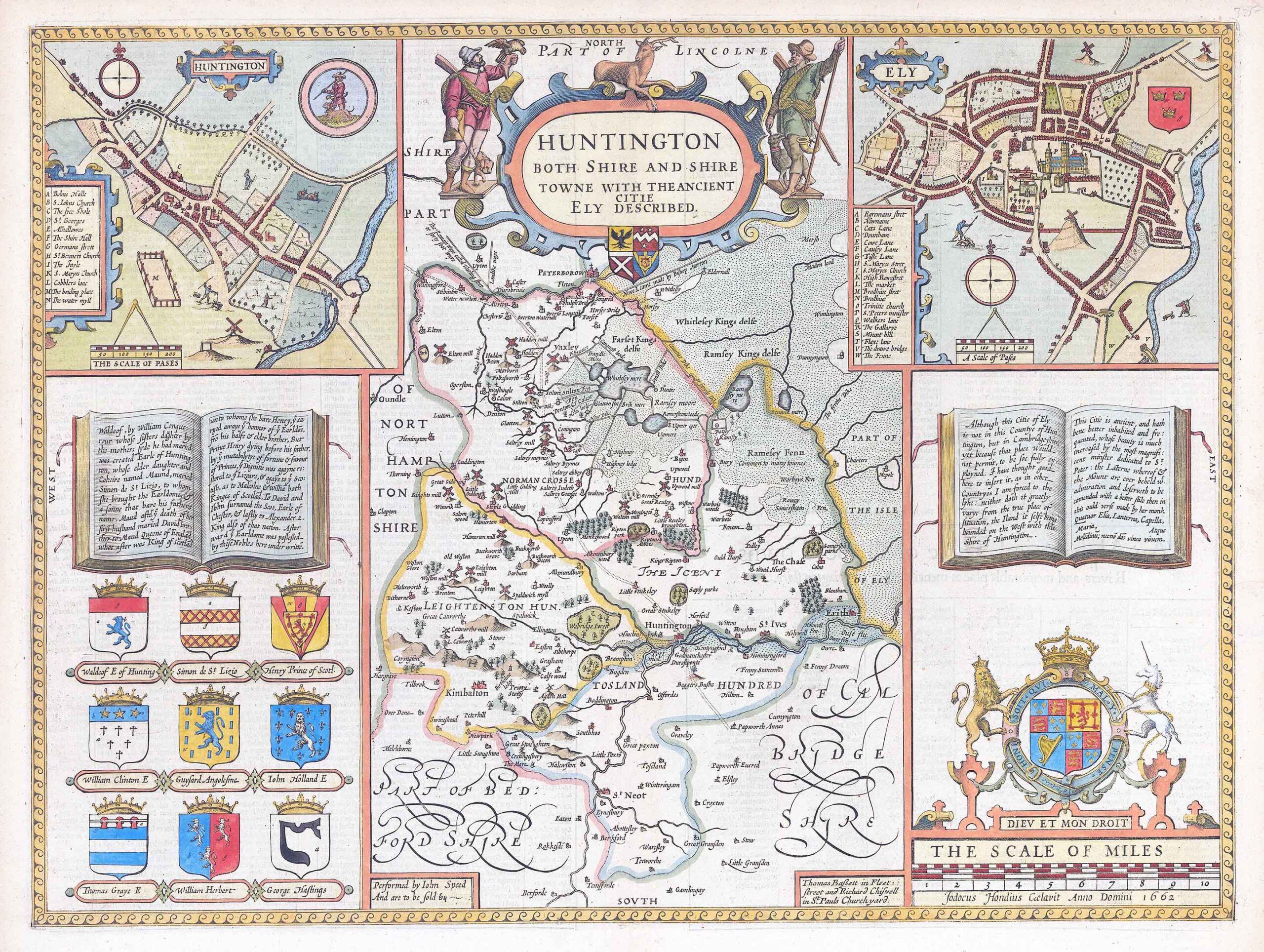 1676 - "HUNTINGTON Both Shire and Shire Towne with the Ancient Citie Ely Described" Fine antique map by John Speed & published by Bassett & Chiswell in St Puls Churchyard. A highly decorative and finely engraved 17th Century Map of HUNTINGDONSHIRE - with heraldic shields and inset plans of HUNTINGTON & ELY, published in John Speed's THEATRE OF THE EMPIRE OF GREAT BRITAIN (St Pauls Churchyard, Thomas Bassett & Richard Chiswell).