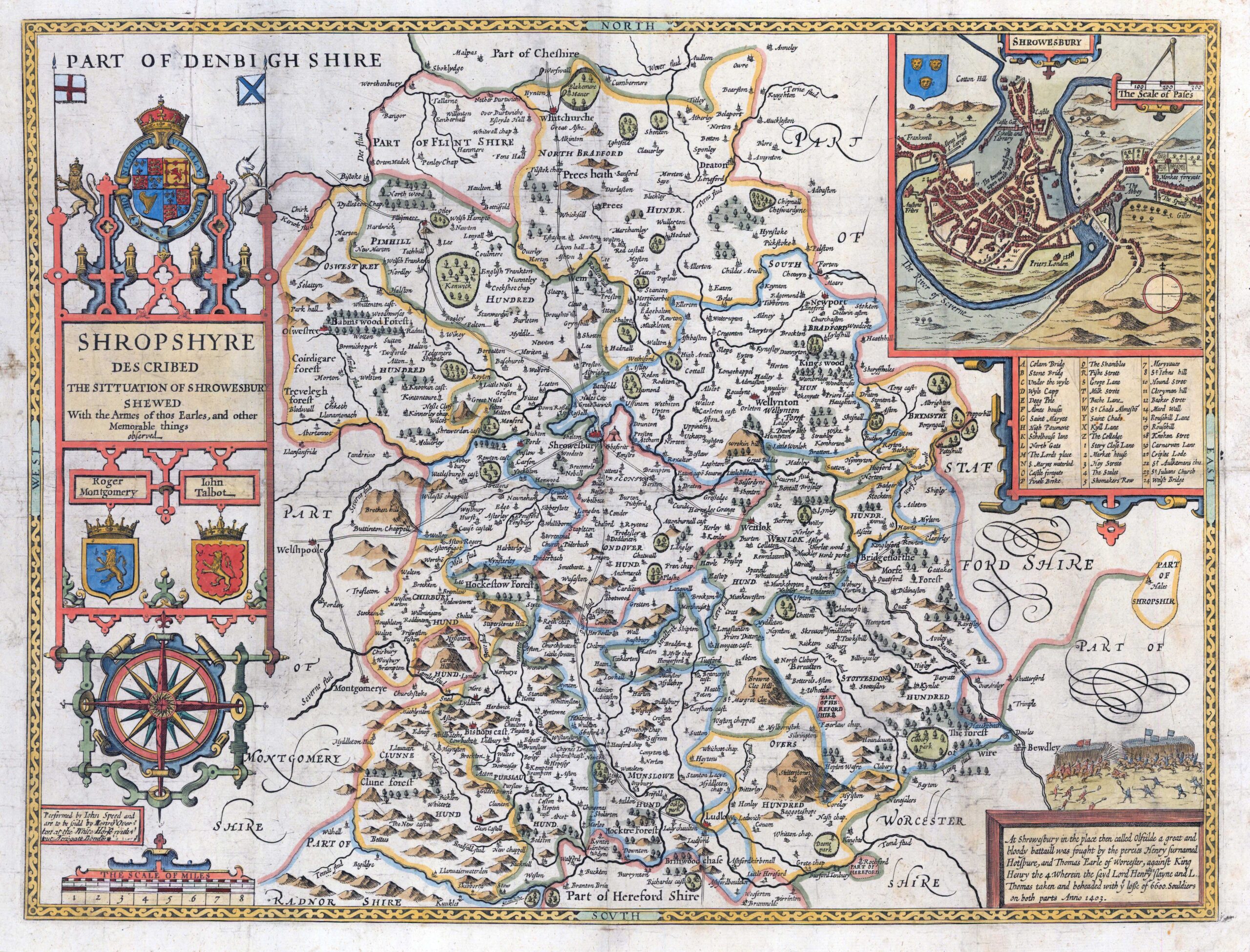 1710 - "SHROPSHYRE DESCRIBED THE SITTUATION OF SHOWESBURY SHEWED With the Armes of thos Earles and other Memorable things observed". A highly decorative map of Shropshire by John Speed. Inset plan of SHROWSESBURY (Shrewsbury), coats of arms & large compass rose. This is from the Henry Overton edition in 1710.