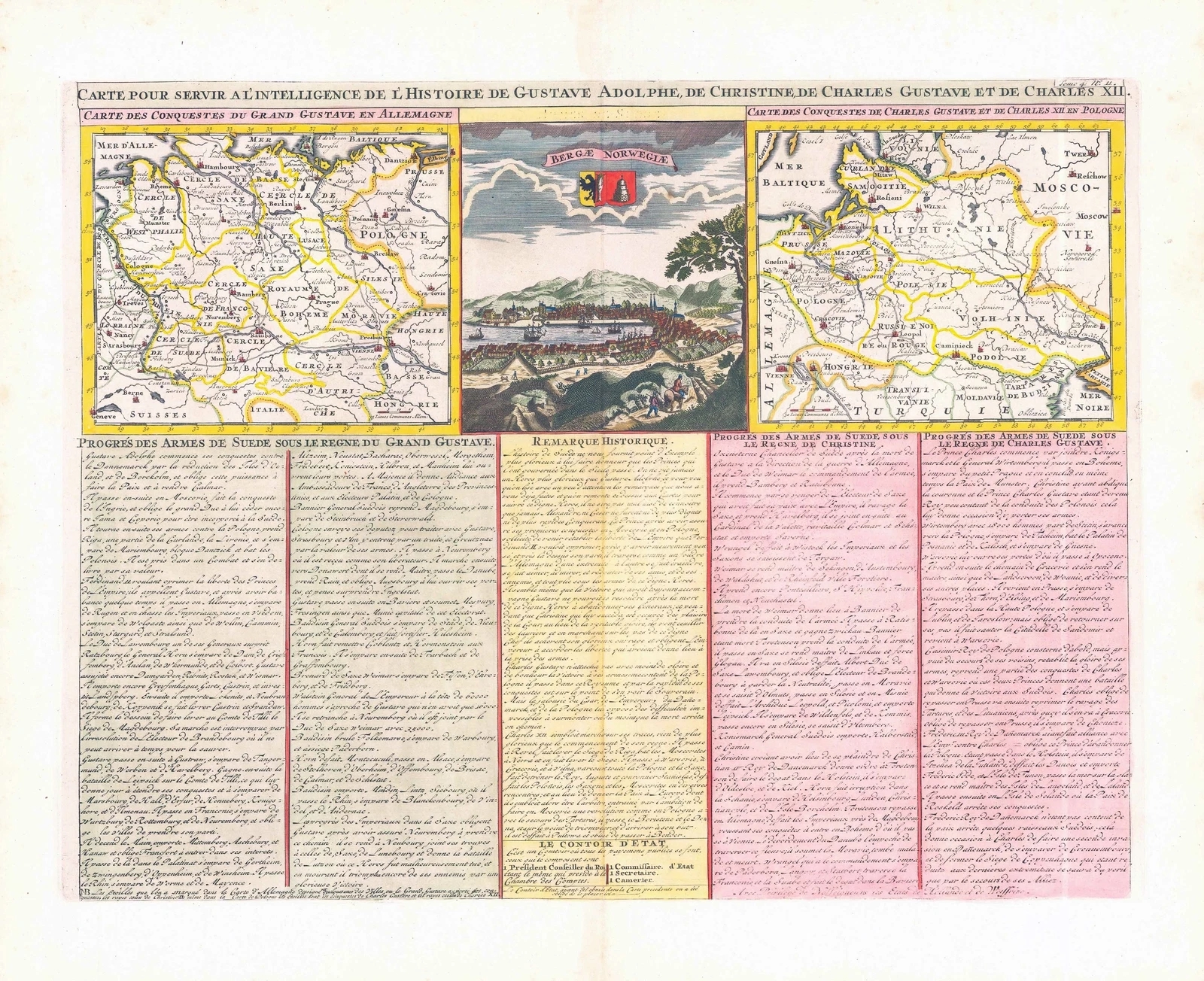 1719 - Large original antique engraved print titled "CARTE POUR SERVIE A L'ITELLIGENCE DE L'HISTOIRE DE GUSTAVE ADOLPHE, DE CHRISTINE DE CHARLES GUSTAVE ET DE CHARLES XII" by Henry Chatelain.