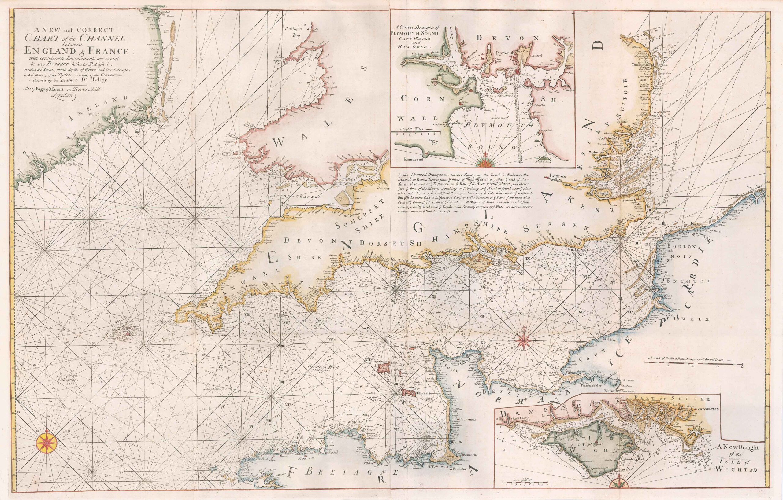 1723 - "A NEW and CORRECT CHART of the CHANNEL between ENGLAND & FRANCE with considerable Improvements not extant in any Draughts hitherto Publish'd; shewing the Sands, Shoals, depths of Water and Anchorage with ye flowing of the Tydes, and setting of the Current; as observ'd by the Learned Dr Halley - Sold by Page & Mount on Tower Hill London".