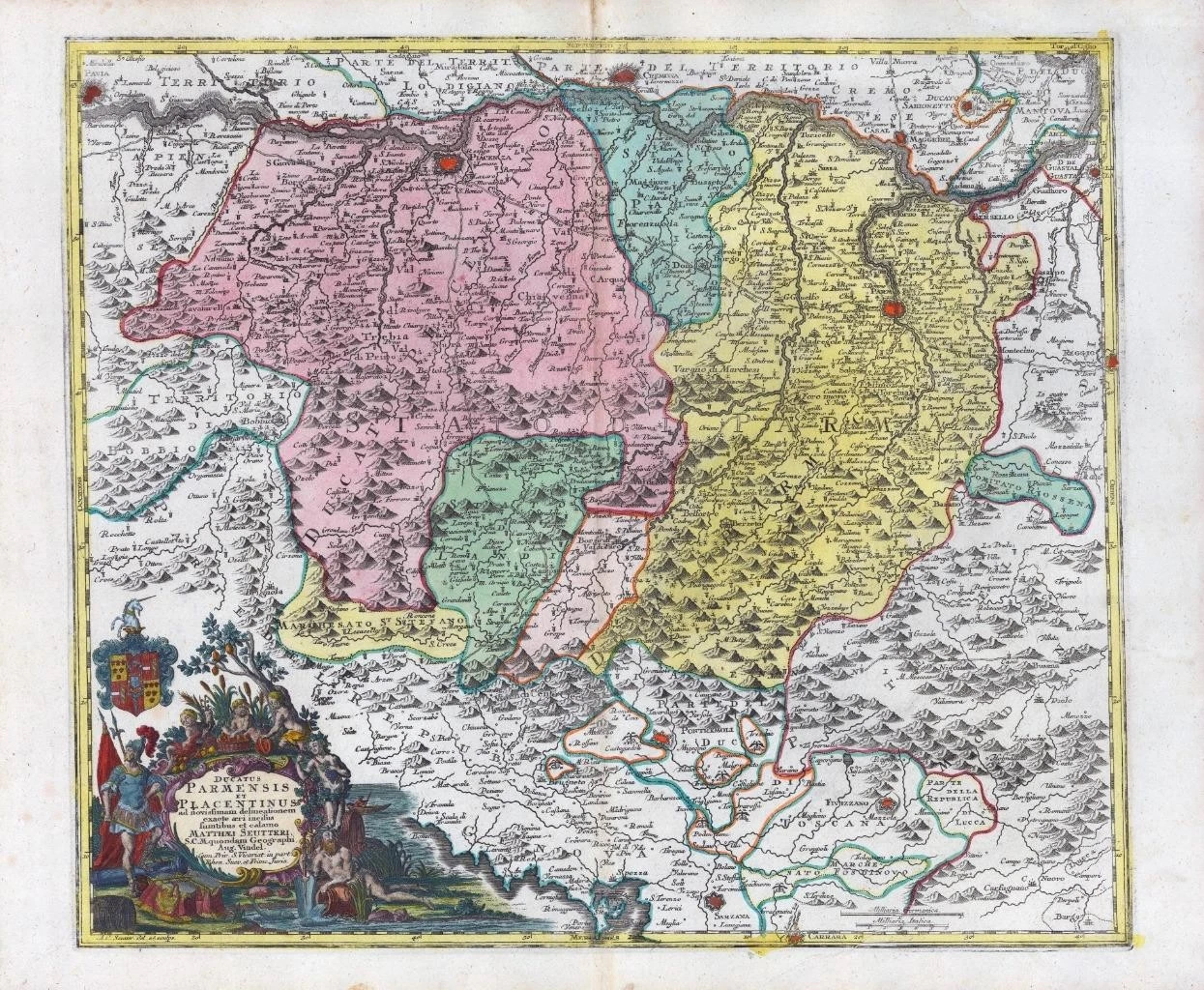 A highly decorative antique map showing the regions of the Duchy of Parma and Piacenza. Bottom left a fine cartouche depicting an Allegory with Bacchanalia, a Deity of the Rivers and a warrior.