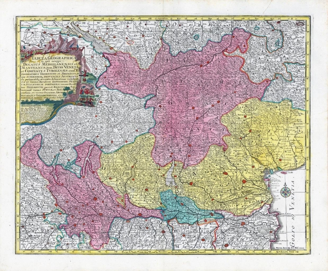 1730 - ' Tabula Geographica in qua Integri Ducatus Mediolanensis et Mantuanus, Veneta et Comitatus Tyrolensis, cum Episcopatus, Tridentino et Brixensi '