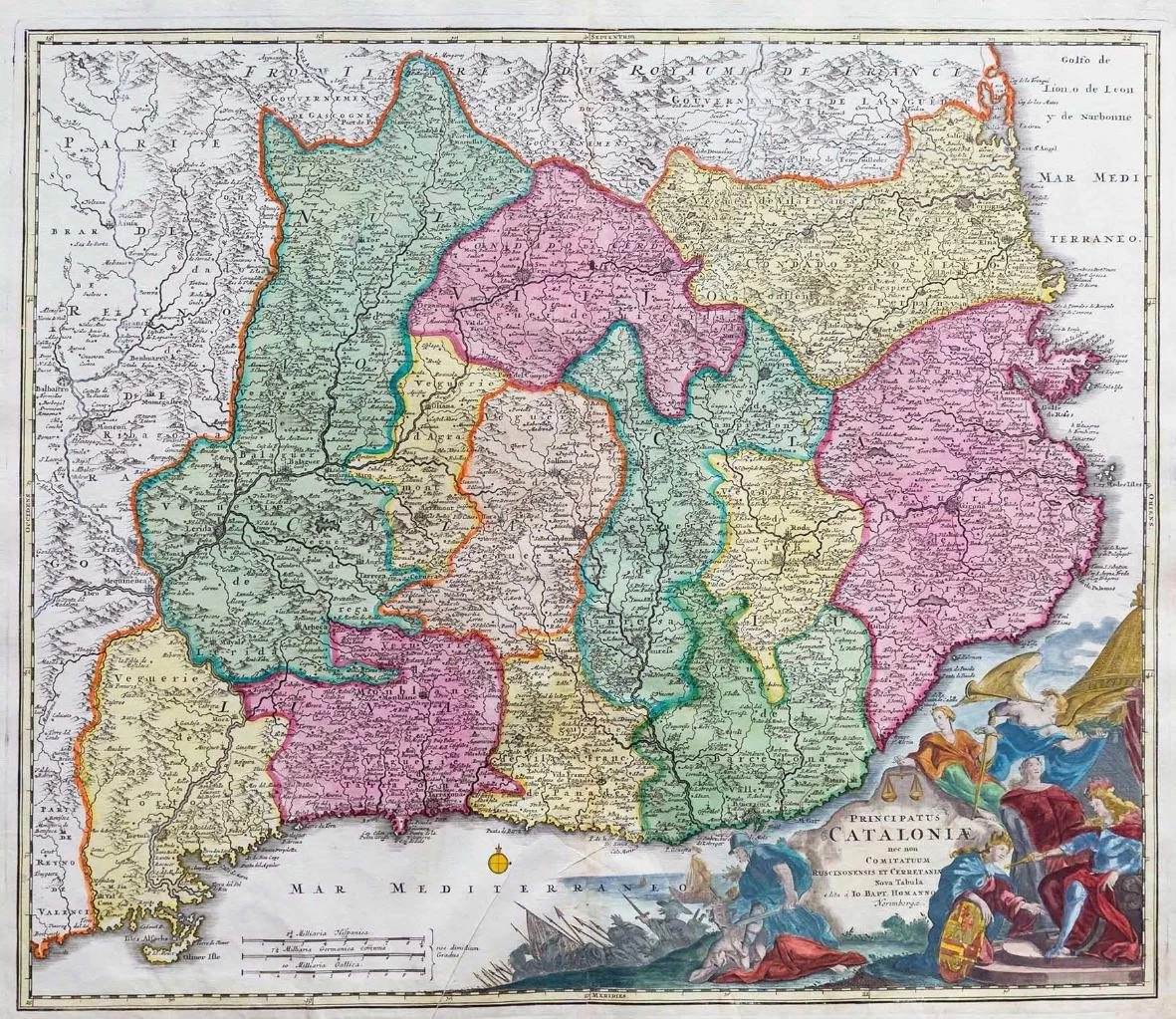 A fine and highly decorative map of the region of Catalonia, published by Johann Baptist Homann. Stunning elaborate cartouche in bottom right corner and the various regions of Catalonia highlighted.