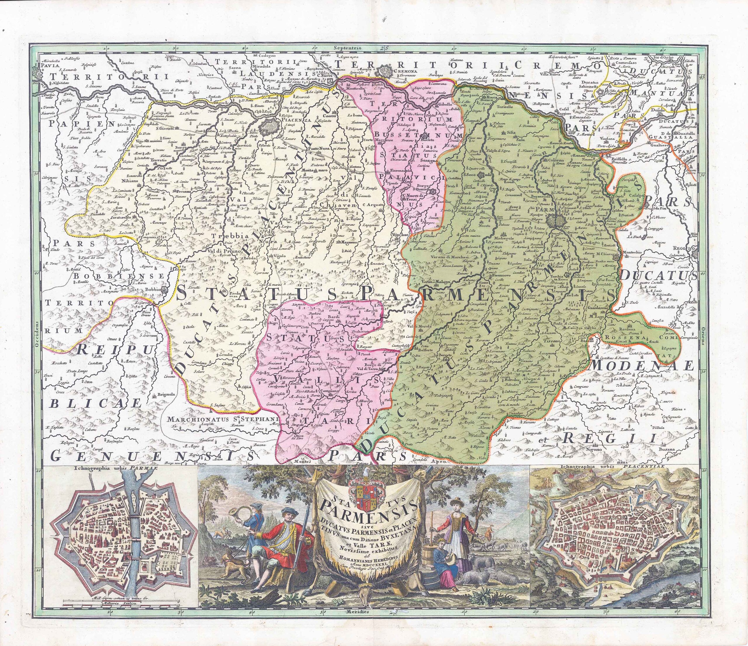 1731 - "STATUS PARMENSIS sive DUCATUS PARMENSIS et PLACENTINUS" - A fine copper engraved map of the region around Parma by Homann Erben. Shows the area of Italy between Pavia and Reggio Emilia with Parma, Cremona and Piacenza. Below a beautiful title cartouche and a plan of Parma and Piacenza.