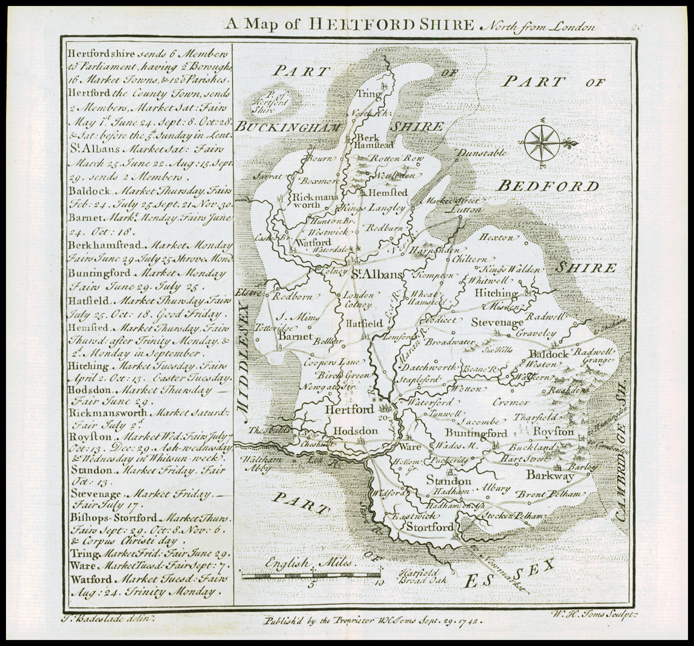 1745 "A MAP OF HERTFORDSHIRE NORTH from London". A fine original antique map by Thomas Badeslade & William Henry Toms. Copper engraved map with additional information on the major towns with details of Market Days, Fairs, Members of Parliament and other points of interest. Condition is excellent with central fold as issued. Overall size approx 17.5cm x 16.5cm.