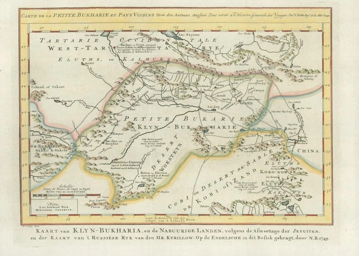 1749 - An original copperplate engraved antique hand coloured map titled:" CARTE de la PETITE BUKHARIE et PAYS VOISINS ".