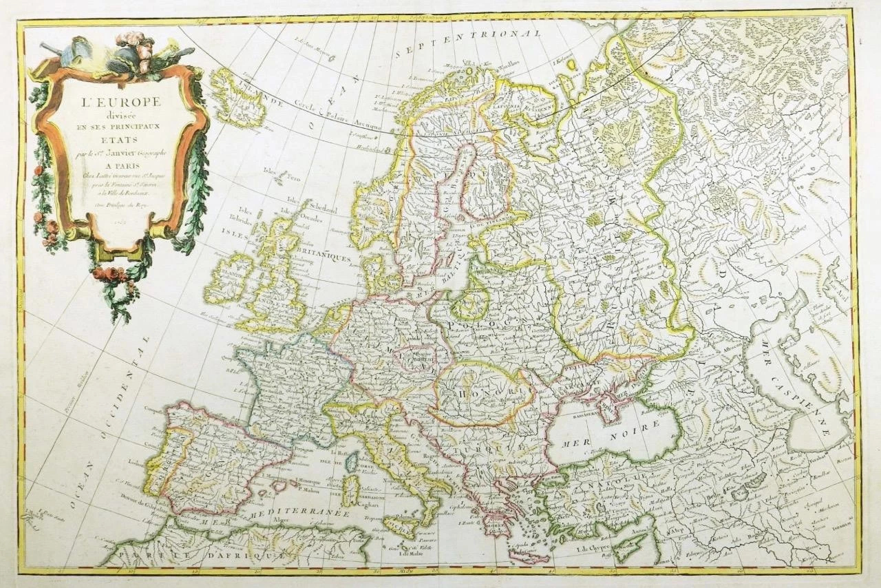 This is a good example of Jean Janvier's 1762 decorative map of the Europe. Janvier's map covers from Iceland to the Caspian Sea and from North Africa to the Arctic. The map is divided into countries and kingdoms with color coding according to region. As a whole it offers excellent detail throughout showing mountains, rivers, forests, national boundaries, regional boundaries, forts, and cities. The scope of the map is worth noting, as it intentionally encompasses not just Europe but the extent of European cultural expansion into the surrounding areas. It is no error that the map extends westward to Portuguese Madeira and Porto Santo, nor northwards to embrace Iceland, nor that it extends eastward into the Russian dominated lands beyond the Caspian. This was the 'Greater Europe,' a vast region considered naturally part of Europe's cultural patrimony. A large decorative title cartouche appears in the upper left quadrant.