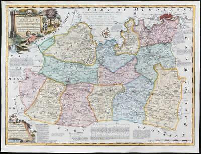 Finely engraved map by Emanuel Bowen showing the County of Surrey. Decorative Cartouche at the top left with dedication cartouche at the bottom left. London is shown on the other side of the River Thames and Brixton, Peckham, Camberwell & Clapham all shown in detail on this map as part of Surrey. This map was produced for the inclusion in the Large English Atlas which was the finest county atlas produced in the 18th century. Clearly engraved with panels of text in the areas surrounding each county describing the commerce and the state of the principal towns and cities.