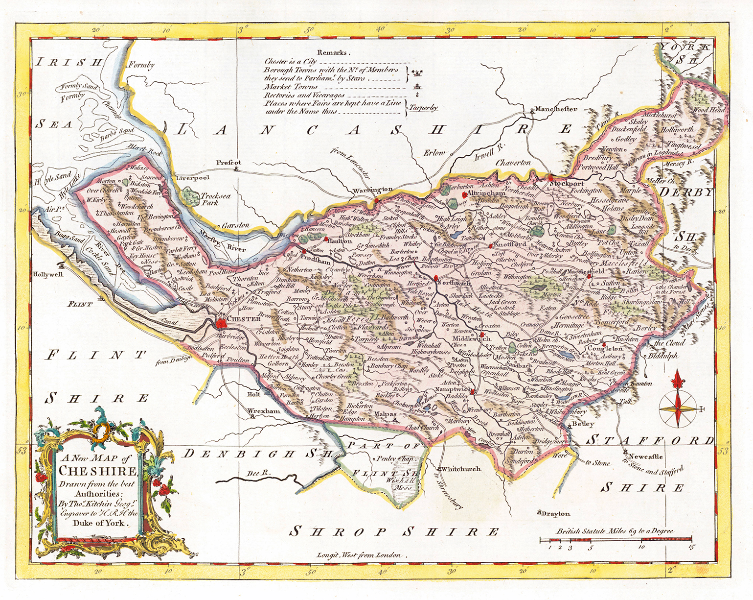 1764 - Original Antique Map by Thomas Kitchin titled "A NEW MAP OF CHESHIRE". 'Drawn from the Best Authorities by Tho.Kitchin Geogr Engraver to H.R.H. the Duke of York'. Fine hand colouring and measuring approx 28cm x 22cm (11in x 8 3/4in) in excellent condition.