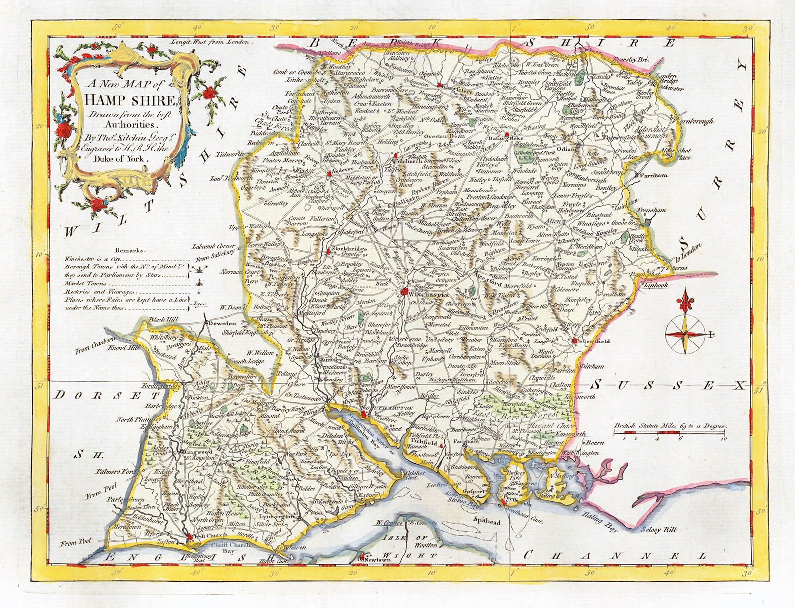 1764 - Original Antique Map by Thomas Kitchin titled "A NEW MAP OF HAMPSHIRE". 'Drawn from the Best Authorities by Tho.Kitchin Geogr Engraver to H.R.H. the Duke of York'. Fine hand colouring and measuring approx 28cm x 22cm (11in x 8 3/4in) in excellent condition.