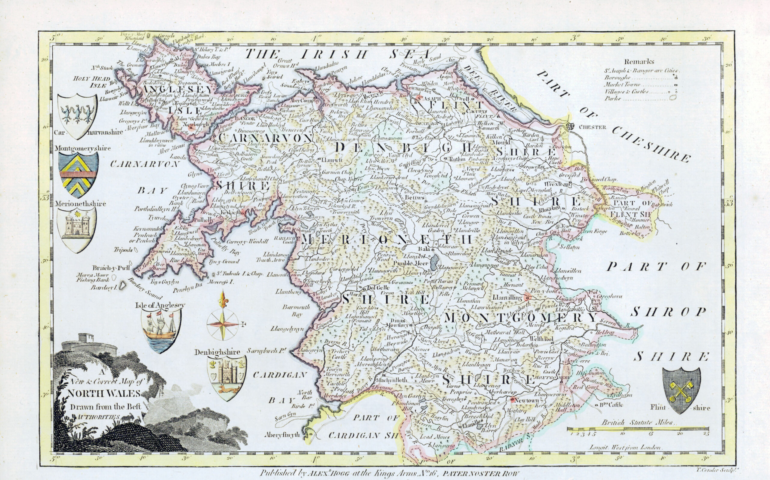 1769 "A New & Correct map of NORTH WALES Drawn from the Best Authorities". A fine original antique map published by Alex Hogg, Paternoster Road & engraved by T Conder. The maps is detailed with towns, roads and topography and feature decorative title cartouches. From George Augustus Walpoole's 'New and Complete British Traveller'.