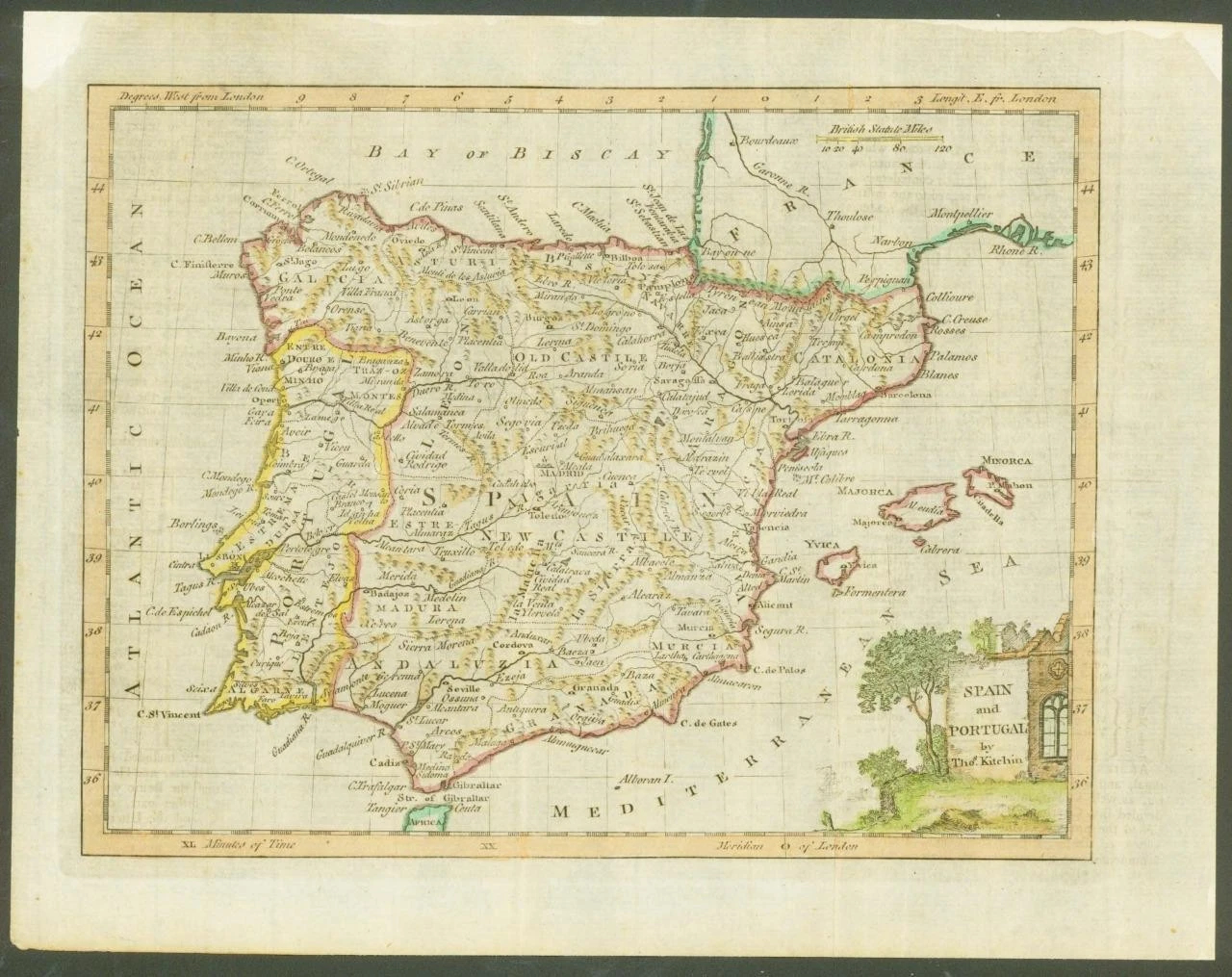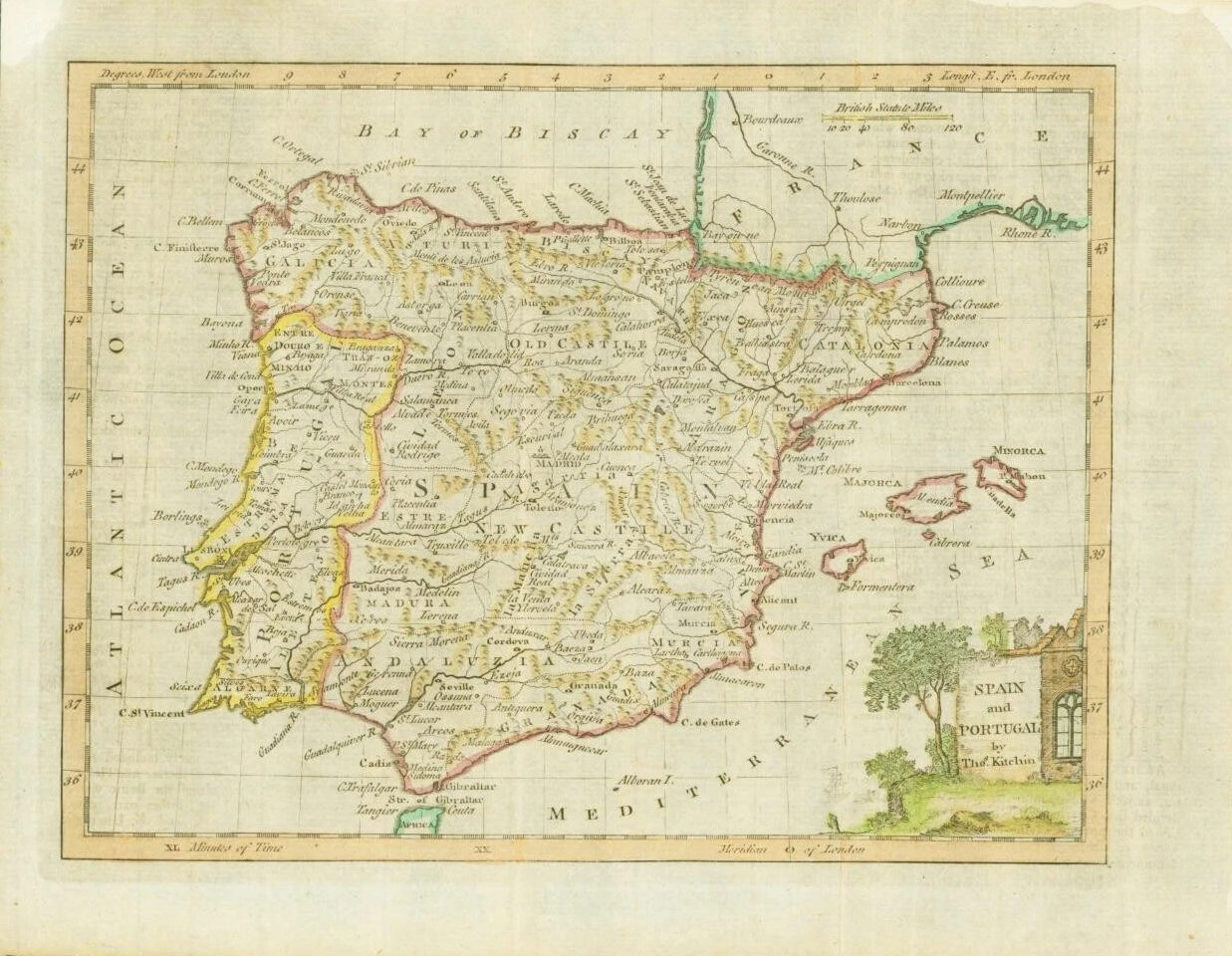 1770 - Original Antique Map "SPAIN AND PORTUGAL" by T KITCHIN Hand coloured