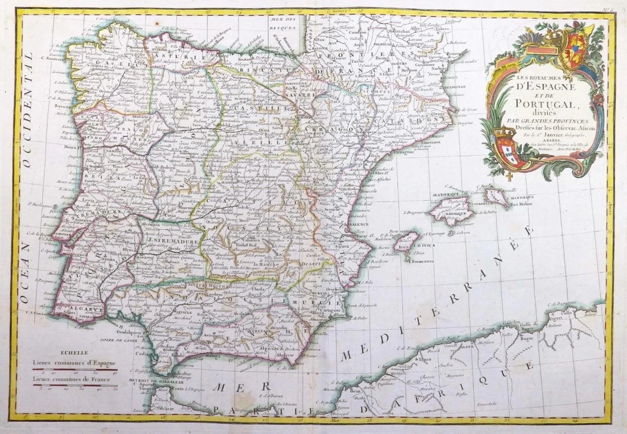 A beautiful example of Jean Janvier's 1783 decorative map of Spain and Portugal. Janvier's map covers the Iberian Peninsula as well as adjacent parts of France and Africa. The map prominently displays the Balearic Islands of Majorca, Minorca, and Ibiza.