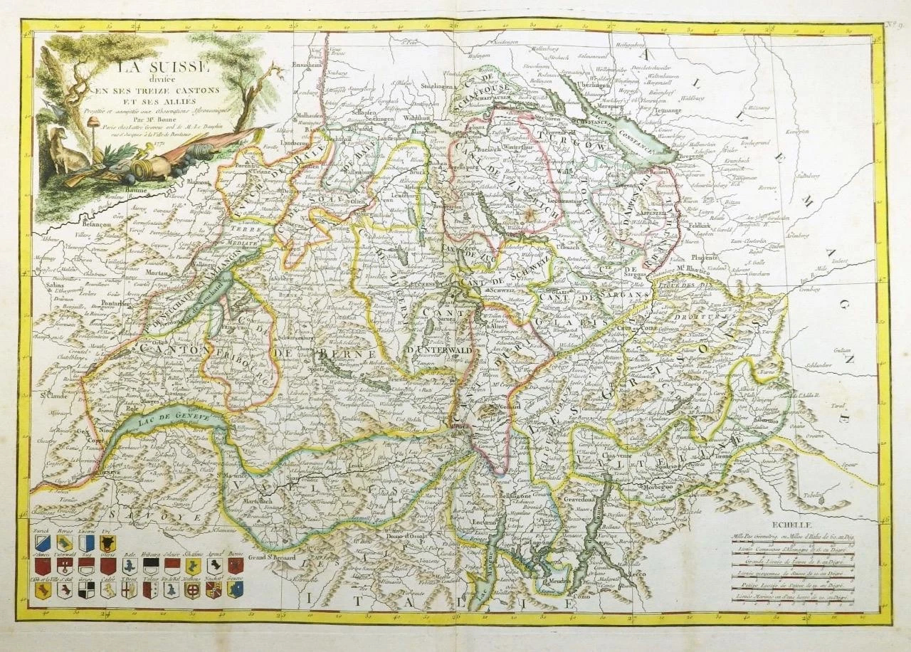 1771 Fine engraved antique Map of SWITZERLAND LA SUISSE Coats of Arms Bonne (DR)