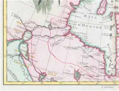 This region was a hotbed of exploration throughout the 18th century. French and English concerns in the New World were desperate for access to the Pacific and the rich Asian markets. These markets had long been dominated by the Spanish who had easy access to the Pacific via Mexico and South America. The French and English set their hopes on a Northwest Passage. By the late 18th century the search for a route through the high Arctic had long been abandoned. Instead, explorers and theoretical cartographers believed that a water route might be found among the elaborate network of lakes and rivers that meandered through central Canada. Our map shows evidence of some of this exploration, particularly the travels of the Quebec born Pierre de La Verendrye and his sons around Lake Nipigon (Lac Alimipigon), the Lake of the Woods (Lac des Bois), and Lake Winnipeg (Lac Ouinipigon and Lac Bourbon).