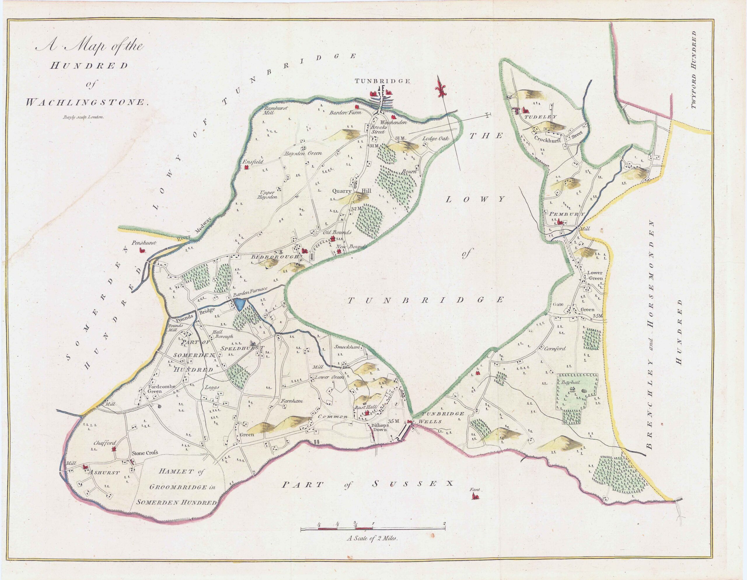 1778 Original Antique engraved Map titled: 'A Map of the HUNDRED of WACHLINGSTONE' And showing the areas of Tunbridge Wells, Tonbridge, Pembury, Tudeley, Crockhurst, Speldhurst, Ashurst, Farnham, Bishops Down, Lower Green, Quarry Hill, Bidborough, Pounds Bridge etc.