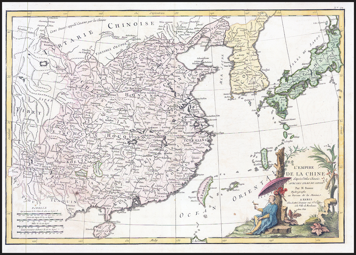 1782 - A fine and very rare original antique map titled 'L'EMPIRE DE LA CHINE d'Apres l'Atlas Chinois, avec les Isles du Japan par M.Bonne'
