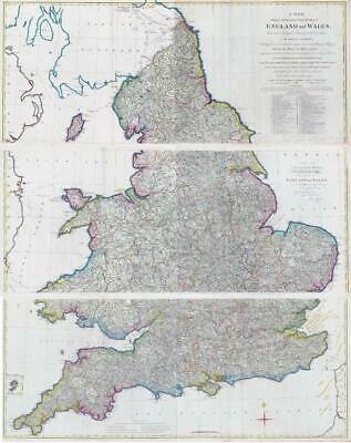 An outstanding example of this extremely rare three sheet map of England & Wales. Each sheet approx 133cm x 55cm and overall when joined together 133cm x 165cm. Table of the vales and valleys, table of explanation, compass rose and dedication, inset map of the Scilly Isles. Early hand colouring.