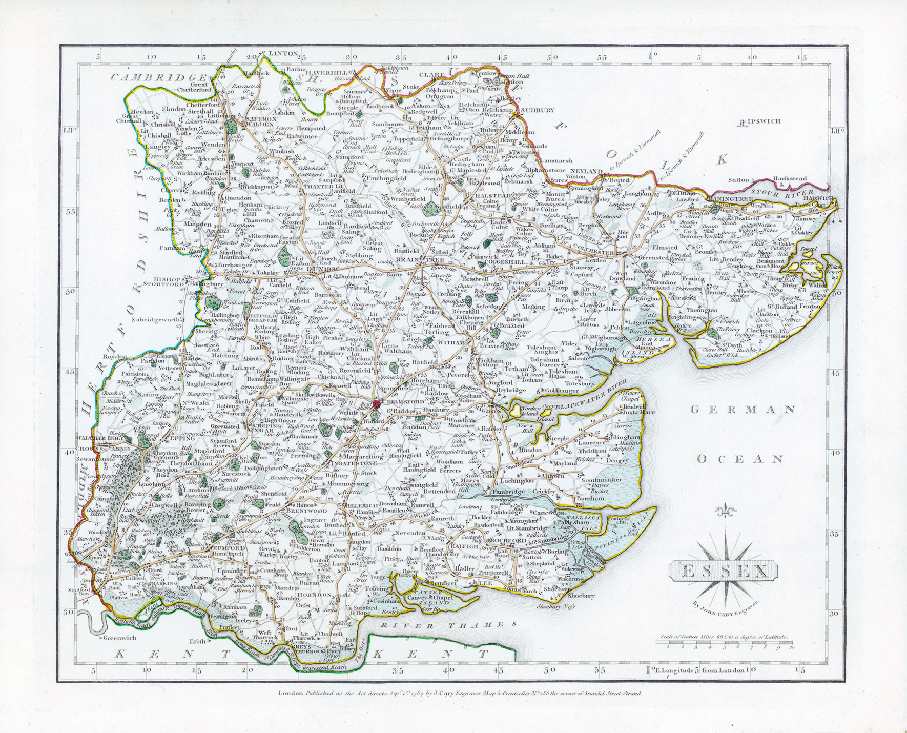 A fine antique engraved map with outline boundary hand colour. Map in excellent condition. Published for "Cary's New and Correct English Atlas Being a New set of County Maps from Actual Surveys". Cary served his apprenticeship as an engraver in London before setting up his own business on the Strand in London in 1783. He soon gained a reputation for his maps and globes, his atlas The New and Correct English Atlas published in 1787 becoming a standard reference work in England.