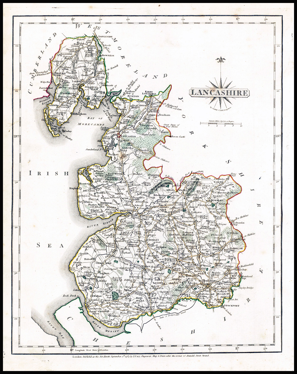 1787 "KENT" A fine antique engraved map with outline boundary hand colour. Map in good condition with some minor ageing. Published for "Cary's New and Correct English Atlas Being a New set of County Maps from Actual Surveys". Cary served his apprenticeship as an engraver in London before setting up his own business on the Strand in London in 1783. He soon gained a reputation for his maps and globes, his atlas The New and Correct English Atlas published in 1787 becoming a standard reference work in England.