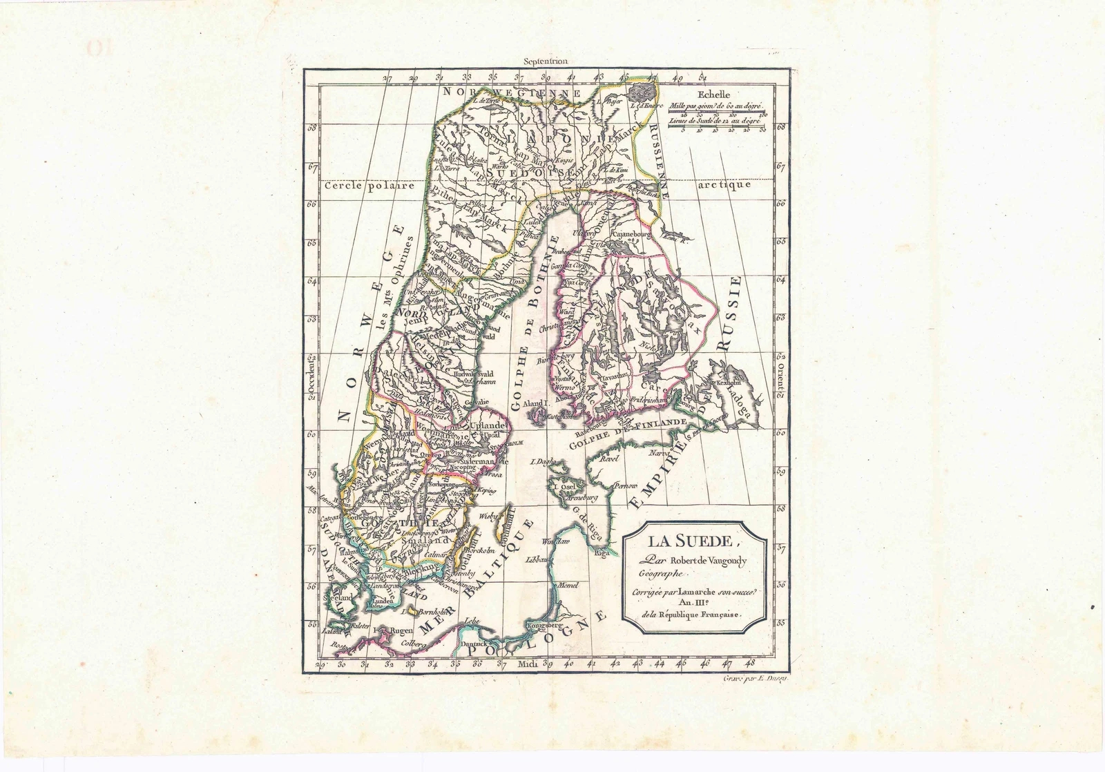1792 - A fine antique map of Sweden titled: “LA SUEDE PAR ROBERT DE VAUGONDY”