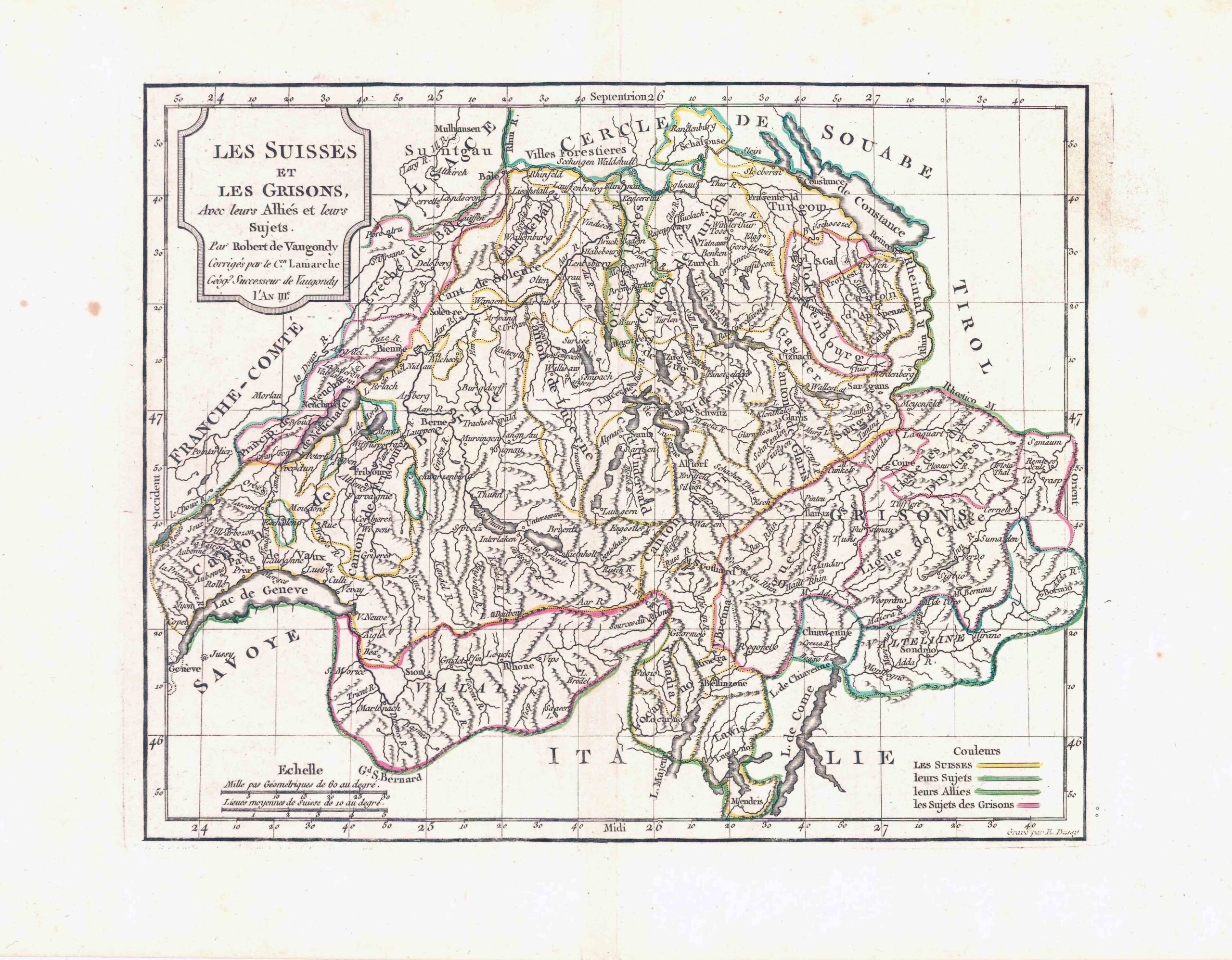 1792 - “LES SUISSES ET LES GRISONS Avec leurs Allies et leuirs Sujects Par Robert de Vaugondy”.