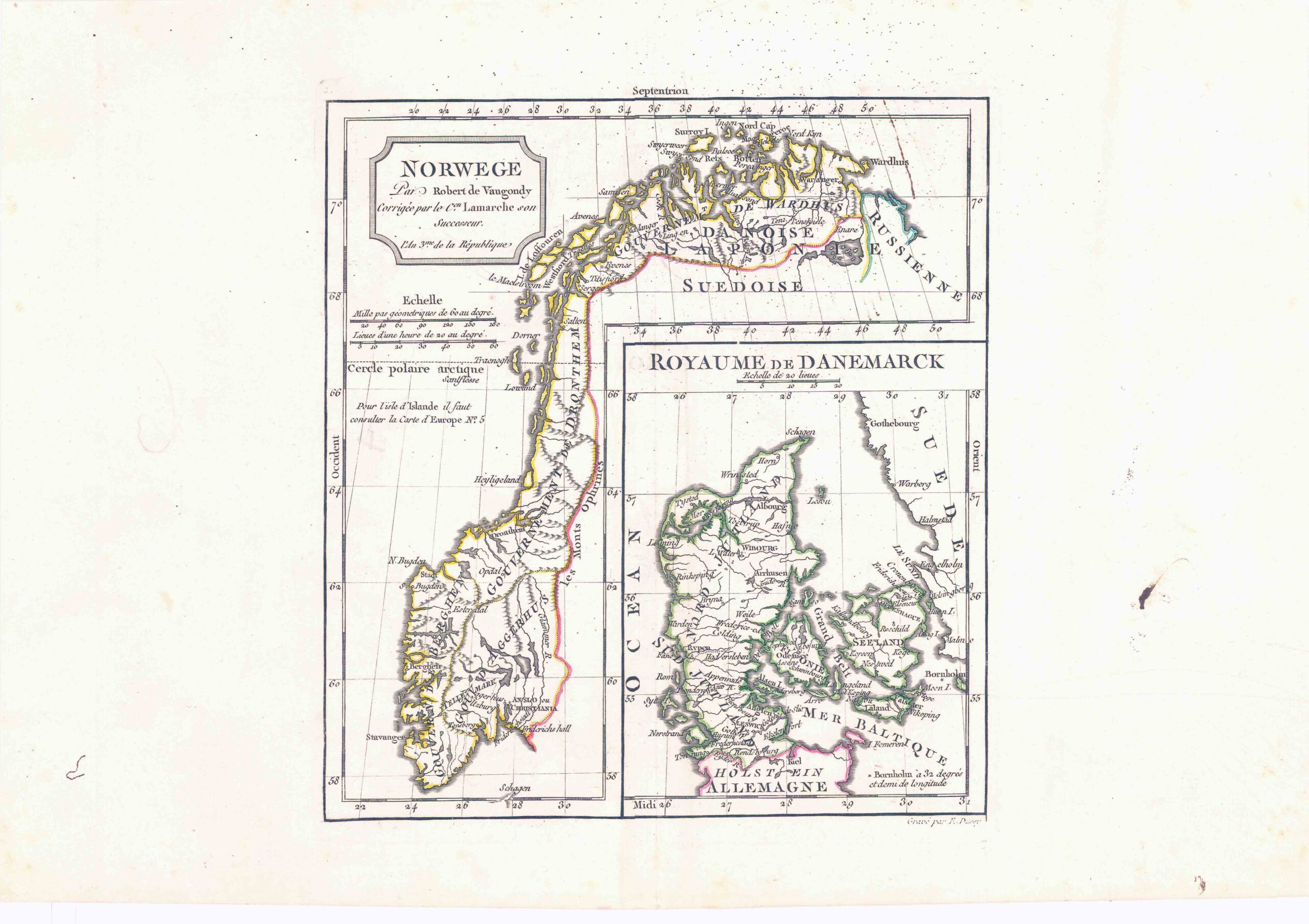 1792 - “NORWEGE PAR ROBERT DE VAUGONDY – ROYAUME DE DANEMARCK”. A fine antique map of Norway & Denmark.