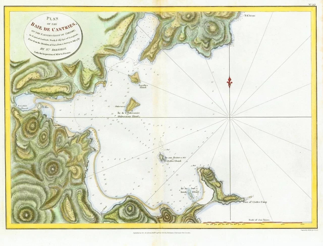 Scarce English edition of La Perouse's important early map chart located on the far eastern coast of Russia. The Bay of Castries, named in honour or Marshal Castries, was explored between 27 July and 2 August 1787 and today houses the Port of De-Kastri.