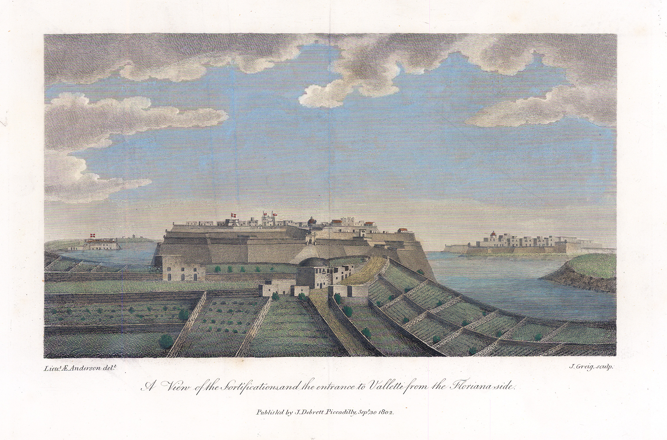 1802 "A VIEW OF THE FORTIFICATIONS AND THE ENTRANCE TO VALLETTE FROM THE FLORIANA SIDE".