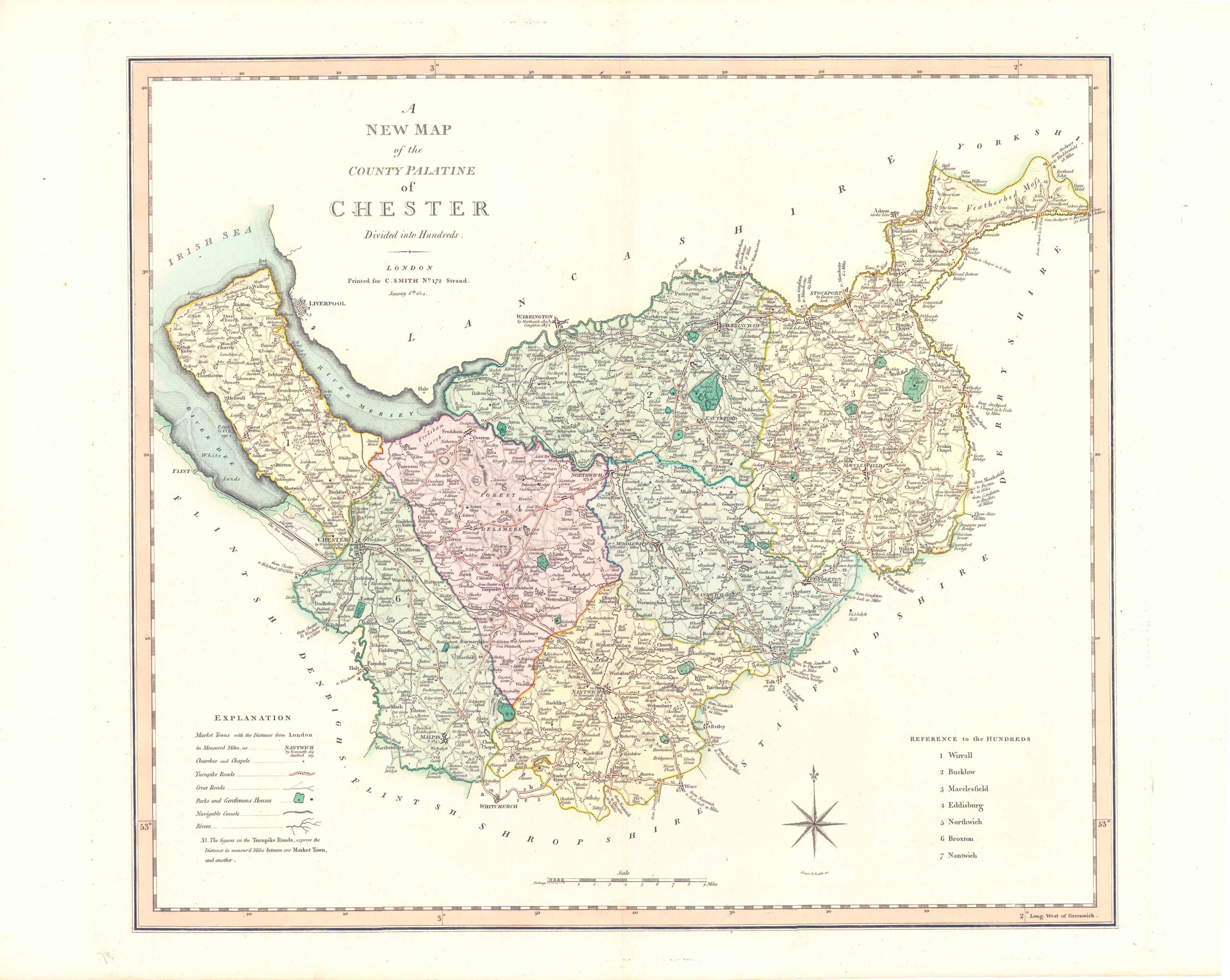 1804 - A fine large original antique map of 'A NEW MAP OF THE COUNTY PALATINE OF CHESTER Divided into HUNDREDS' by C Smith.
