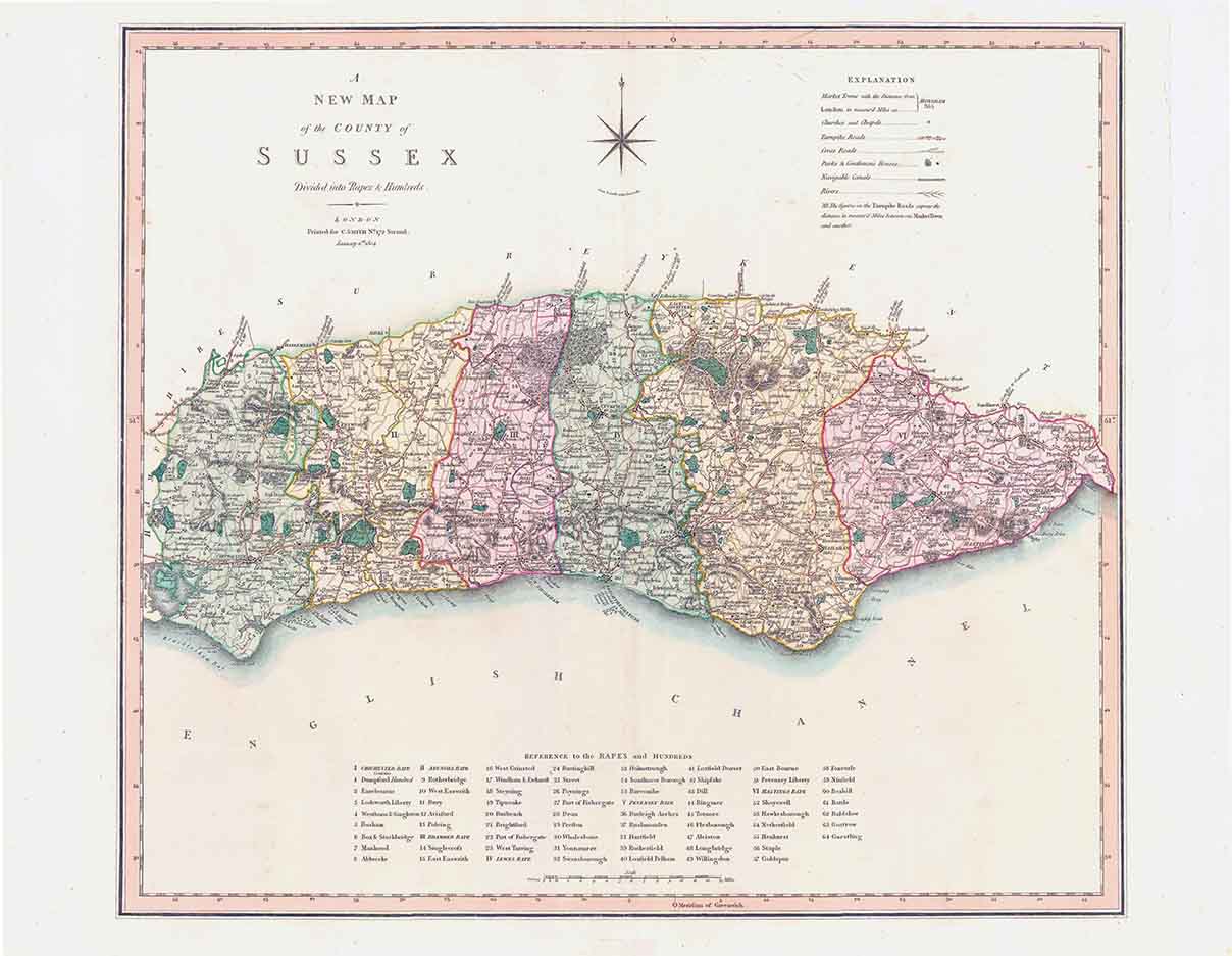 1804 - A fine large original antique map of 'A NEW MAP OF THE COUNTY OF SUSSEX Divided into the RAPES & HUNDREDS' by C Smith.