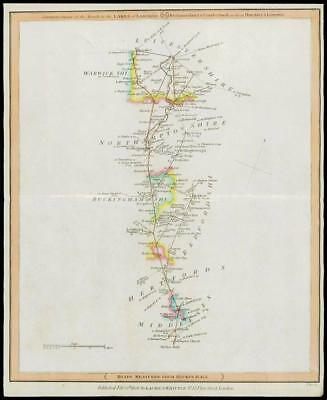 An original antique map taken from Laurie & Whittle's 'Travellers Companion' showing the areas from Holloway Hill, Barnet, St Albans, Harpenden, Dunstable, Luton, Woborn, Newport Pagnell, Northampton, Wellington, Market Harborough, Lutterworth, Billesdon, Leicester etc.