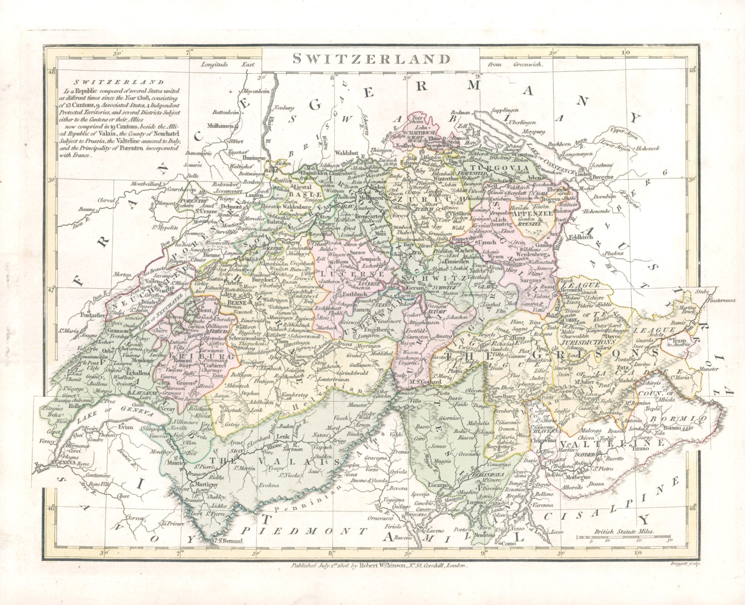 1809 - Original engraved map titled: "SWITZERLAND" published for 'Wilkinson's General Atlas of the World' by Robert Wilkinson, London. With original hand colouring.