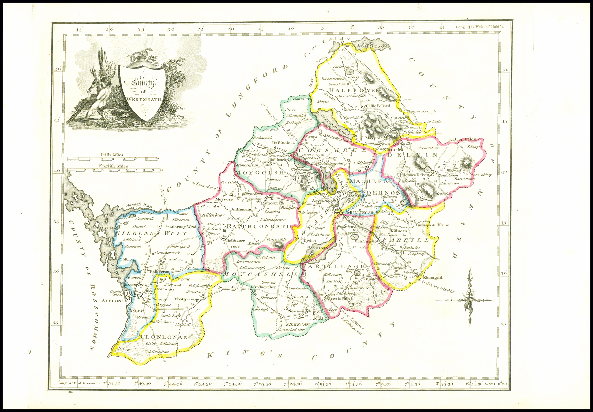 1822 "COUNTY OF WESTMEATH" A fine example of this rare map published by George & John Grierson and Martin Keene in Dublin. Published for "NEW AND CORRECT IRISH ATLAS Being a Complete set of PROVINCIAL AND COUNTY MAPS DIVIDED INTO BARONIES; Containing the Principal CROSS-ROADS, CITIES, TOWNS, RIVERS, CANALS etc, etc.....".