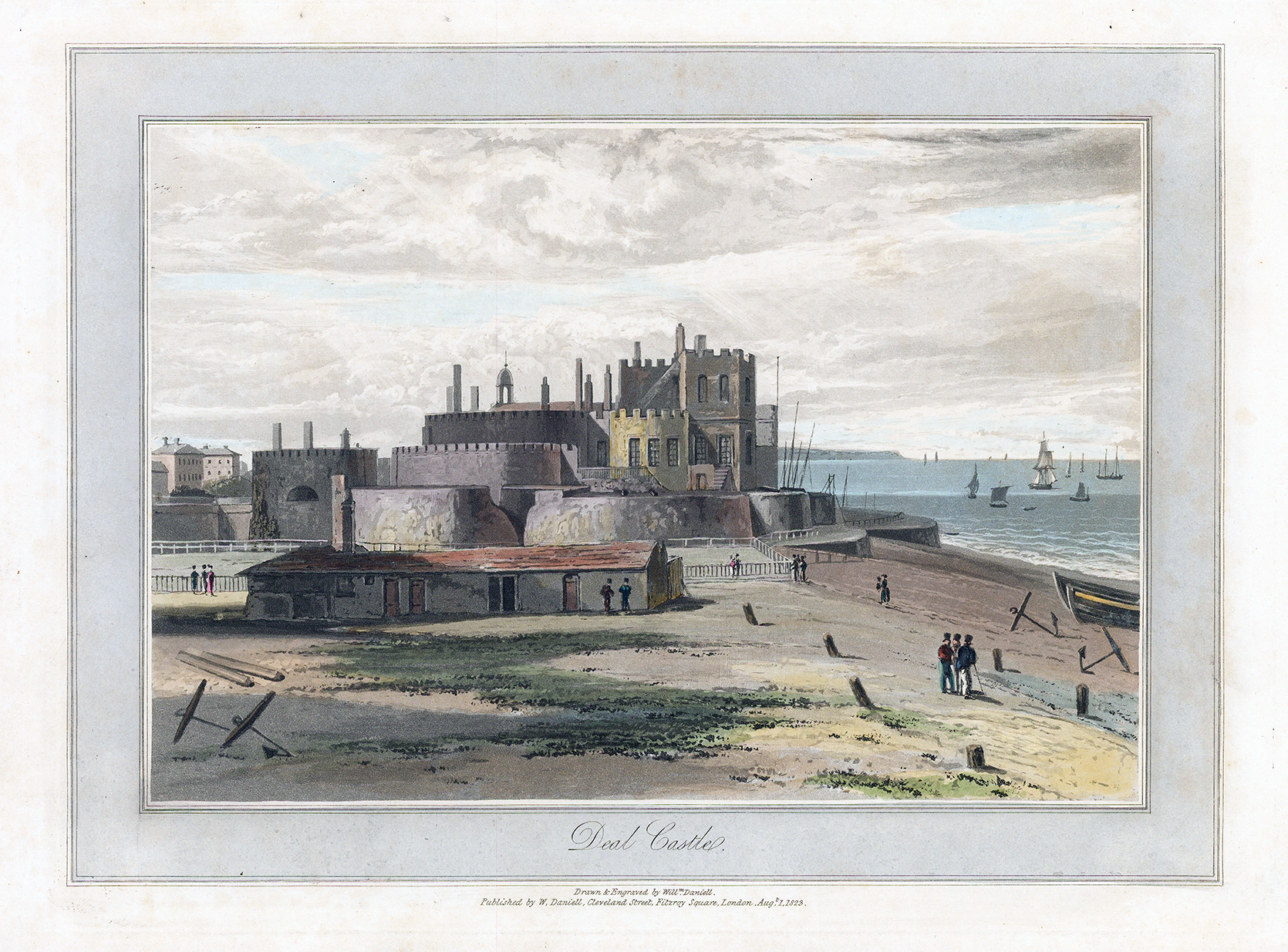 "DEAL CASTLE" An original antique aquatint published for "A VOYAGE ROUND GREAT BRITAIN" by William Daniell. Overall size approx 35cm x 24cm including margins.