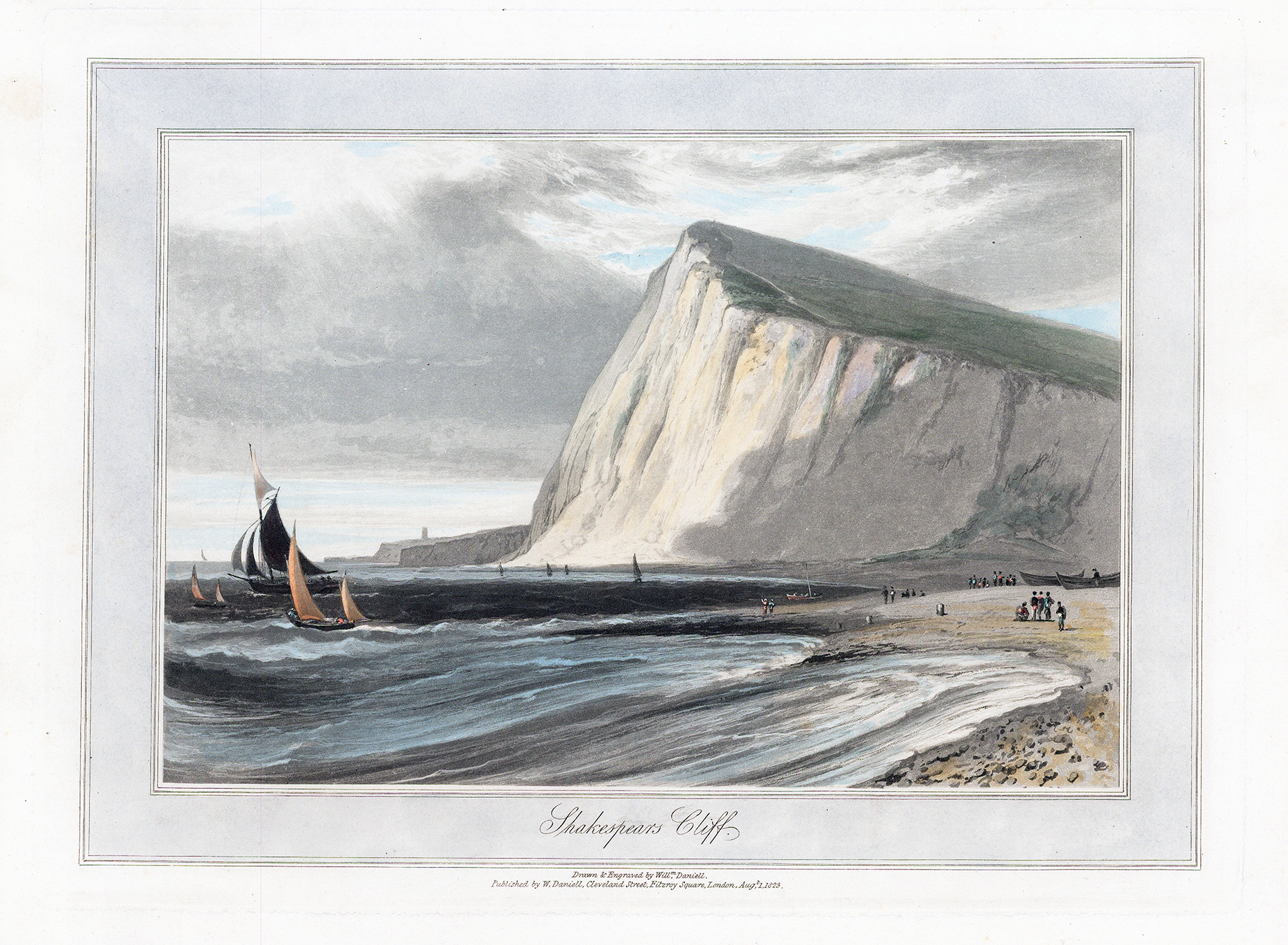 1823 - "SHAKESPEARES CLIFF" An original antique aquatint published for "A VOYAGE ROUND GREAT BRITAIN" by William Daniell. Overall size approx 35cm x 24cm including margins.