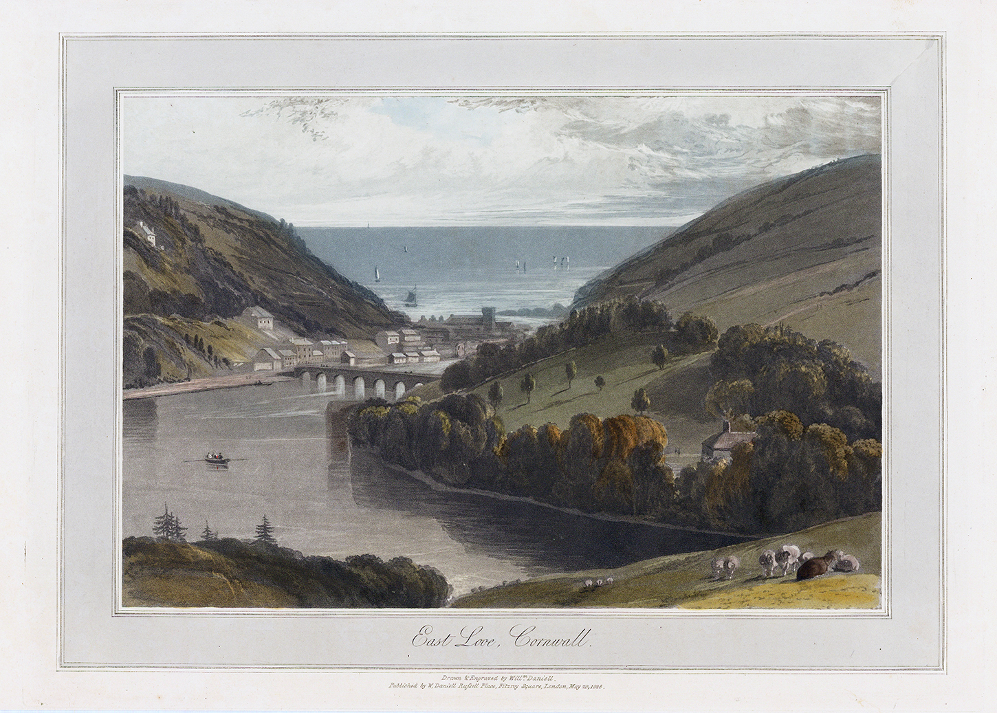 1825 "EAST LOOE, CORNWALL" An original antique aquatint published for "A VOYAGE ROUND GREAT BRITAIN" by William Daniell. Overall size approx 35cm x 24cm including margins.