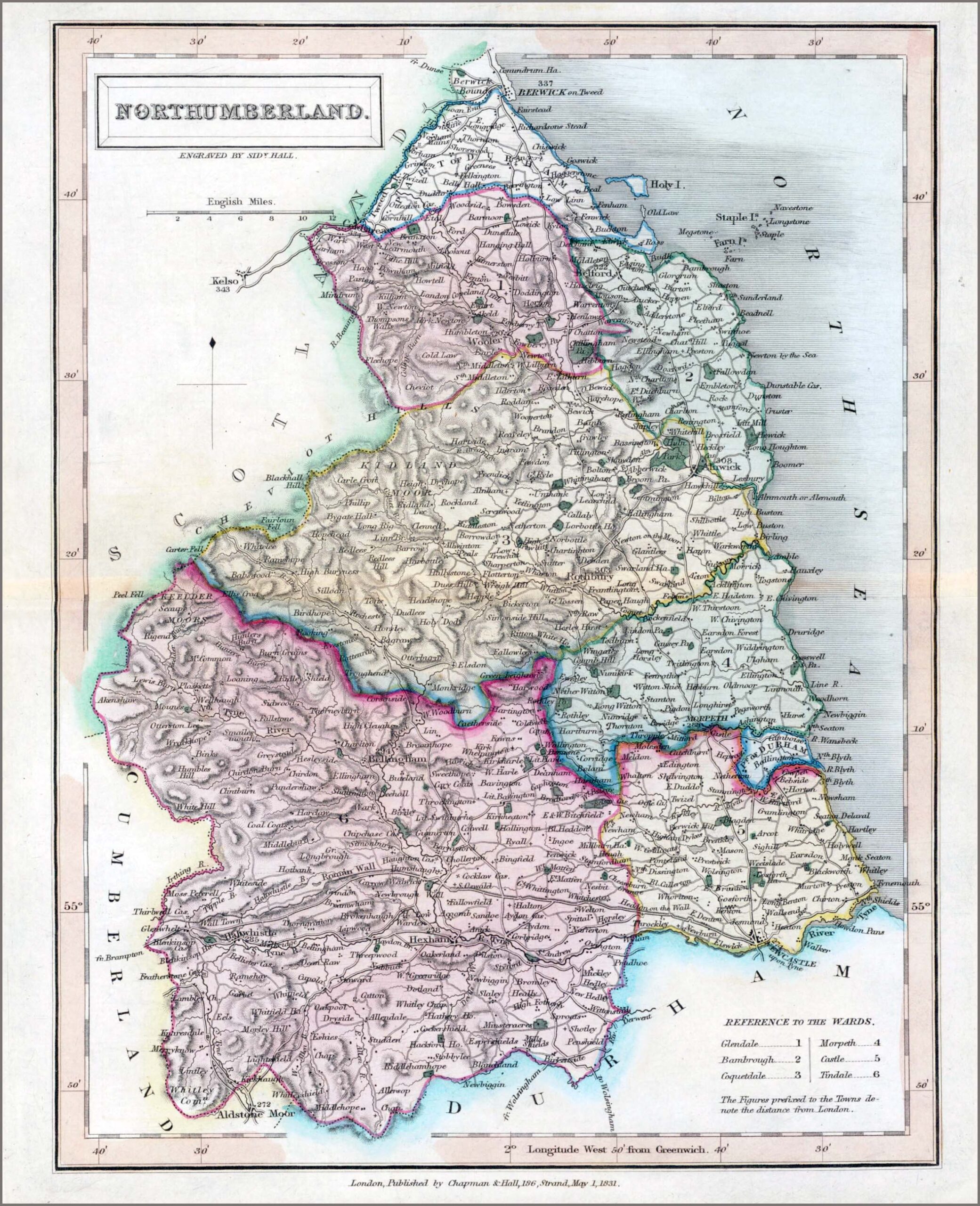 1831 "NORTHUMBERLAND" An original antique map of Northumberland published by Chapman & Hall, London 1831. With original hand colouring and central fold as published. Overall size approx 21.5cm x 26.5cm.