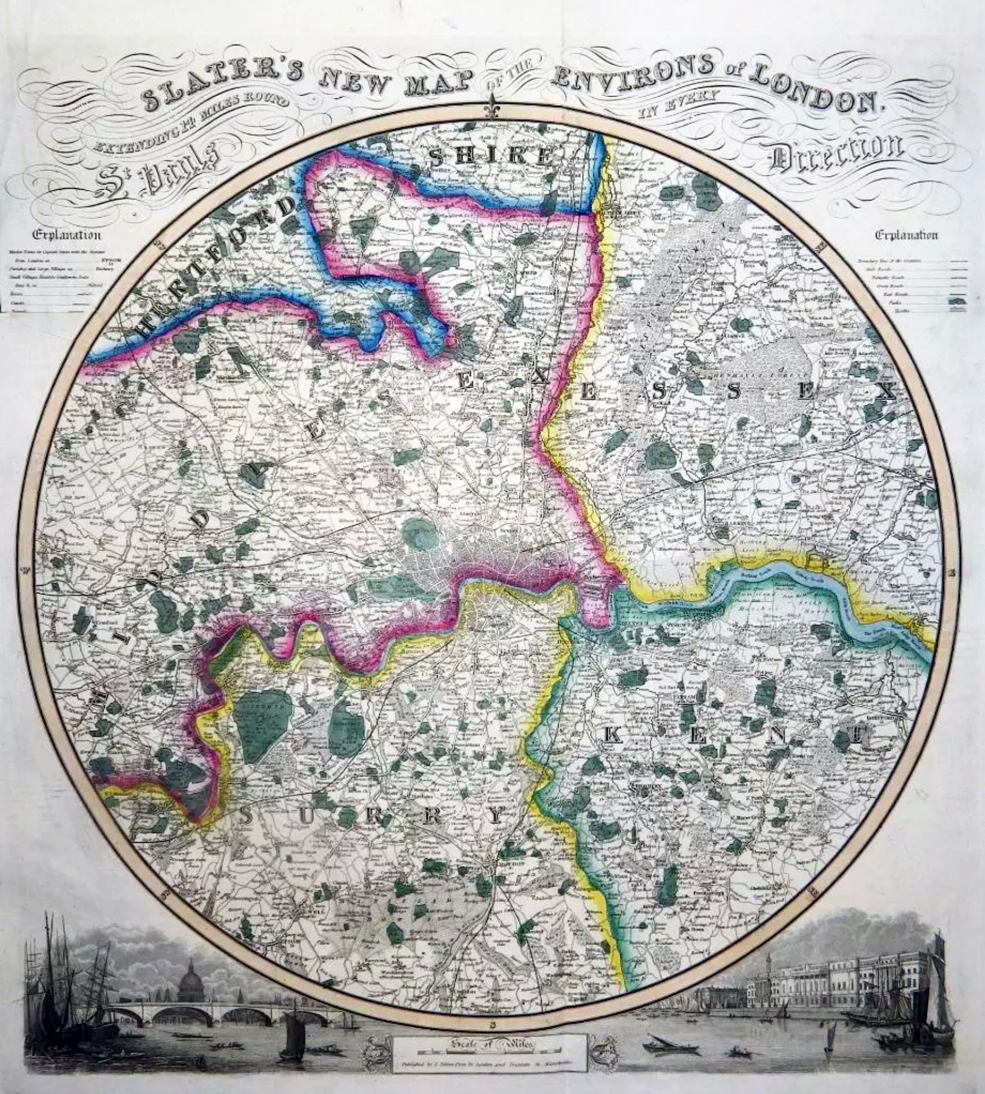 1839 A fine & rare original antique map titled "SLATER'S NEW MAP OF THE ENVIRONS OF LONDON Extending 14 Miles Round St Pauls in Every Direction" by James Pigot and published by I Slater, London & Manchester.