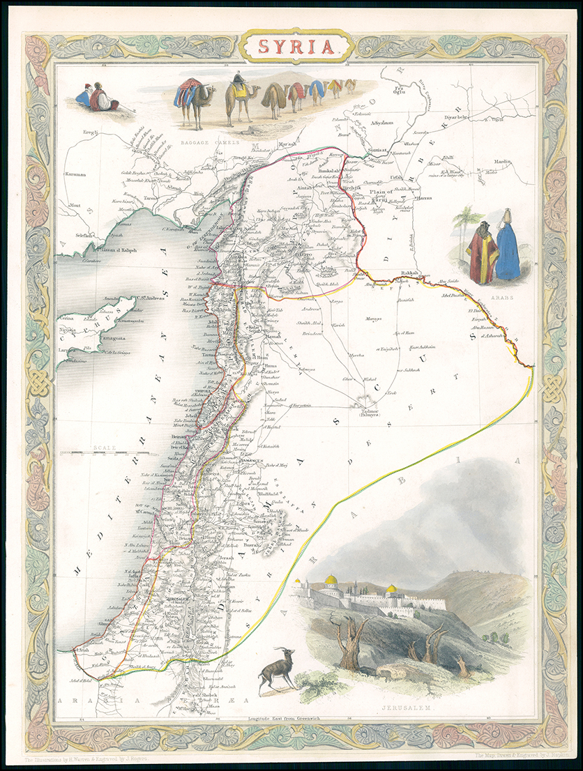 1850 "SYRIA" Original antique map by John Tallis with vignette views of BAGGAGE CAMELS - ARABS - JERUSALEM. Showing the regions of GAZA - ISRAEL - PALESTINE.