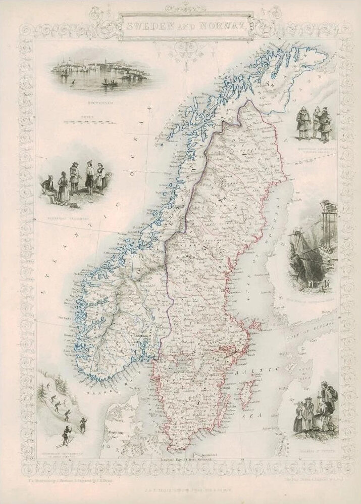 An attractive and decorative map of SWEDEN AND NORWAY with vignette engravings of PEASANTS OF SWEDEN, NORWEGIAN SKIELOBERE, NORWEGIAN LAPLANDERS, IRON MINE OF DANNEMORA, UPSALA, NORWEGIAN PEASANTRY & STOCKHOLM.