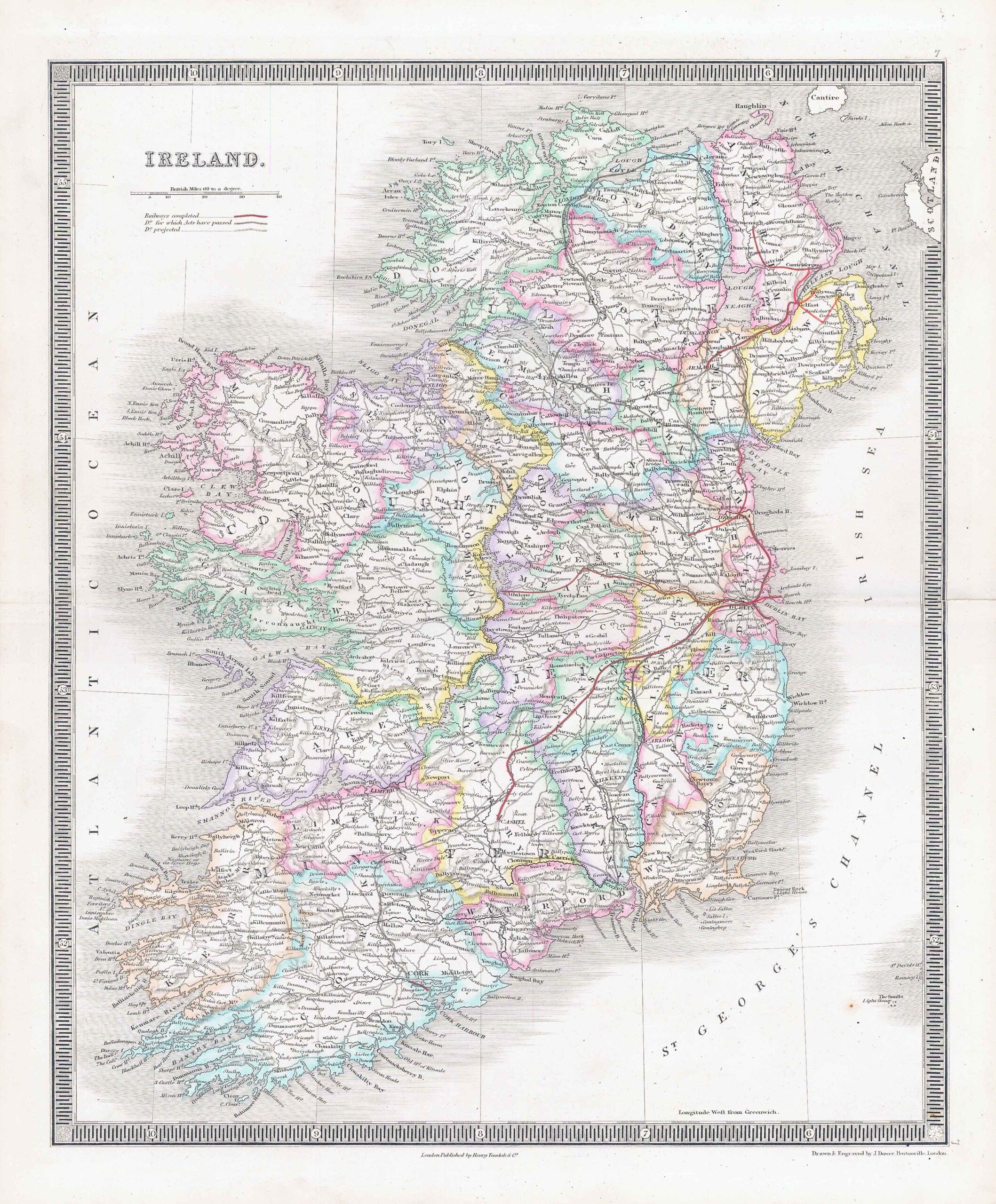 1850 - Original antique map titled "IRELAND" published by Henry Teesdale. Published for "A NEW GENERAL ATLAS OF THE WORLD Compiled and Constructed with the Greatest Care from the Documents in the Foreign, Colonial, and Admiralty Offices, also those of the Honourable the East India Company". Condition is very good with central fold, as issued and with original outline hand colouring.