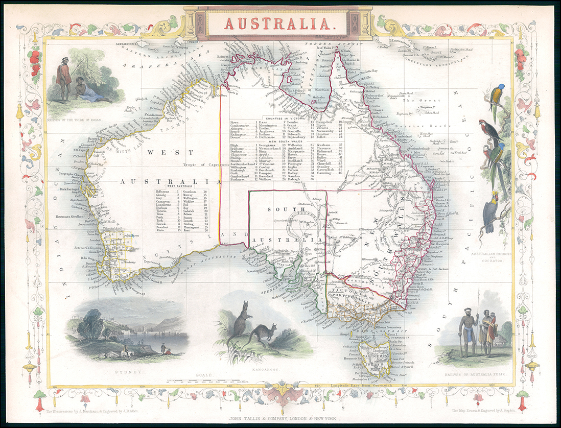 1850 "AUSTRALIA" Original antique map by John Tallis with vignette views of SYDNEY - KANGEROOS - NATIVES OF AUSTRALIA FELIX - AUSTRALIAN PARROTS AND COCKATOO - NATIVES OF THE TRIBE OF BOGAN.