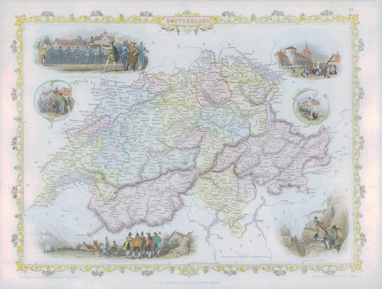 An attractive and decorative map from the RARE First Edition map with vignette engravings of WILLIAM TELL SHOOTING THE APPLE - BERN - THE CAP ON THE POLE - CASTLE OF CHILLON - TYROLESE - CHAMOIS HUNTERS.