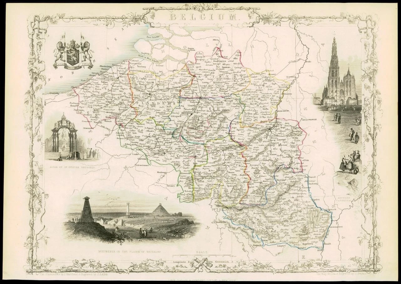 An attractive and decorative map of BELGIUM with vignette engravings of ANTWERP CATHEDRAL, MONUMENTS OF THE PAINS OF WATERLOO & ALTAR OF ST GUDULE BRUSSELS.
