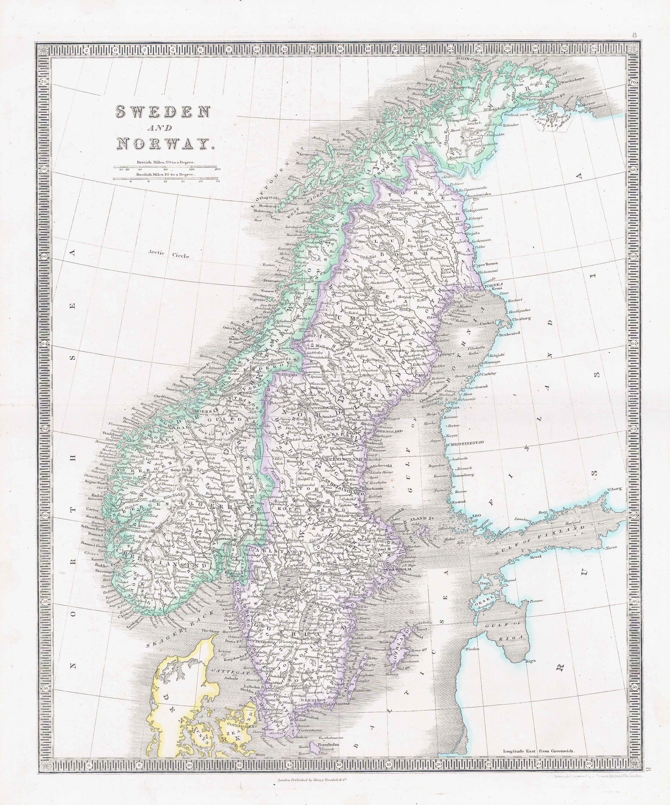1850 - Original antique map titled: "SWEDEN AND NORWAY" published by Henry Teesdale. Published for "A NEW GENERAL ATLAS OF THE WORLD Compiled and Constructed with the Greatest Care from the Documents in the Foreign, Colonial, and Admiralty Offices, also those of the Honourable the East India Company".